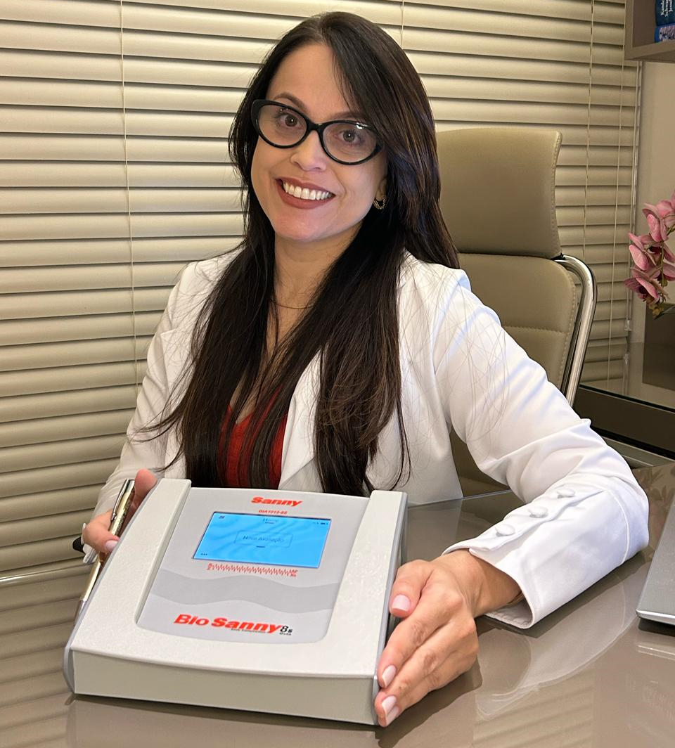 Um dos diferenciais do atendimento presencial é a avaliação por bioimpedância, ferramenta que analisa composição corporal com precisão, identificando massa magra, massa gorda, água corporal e outros indicadores essenciais para personalizar seu plano nutricional.